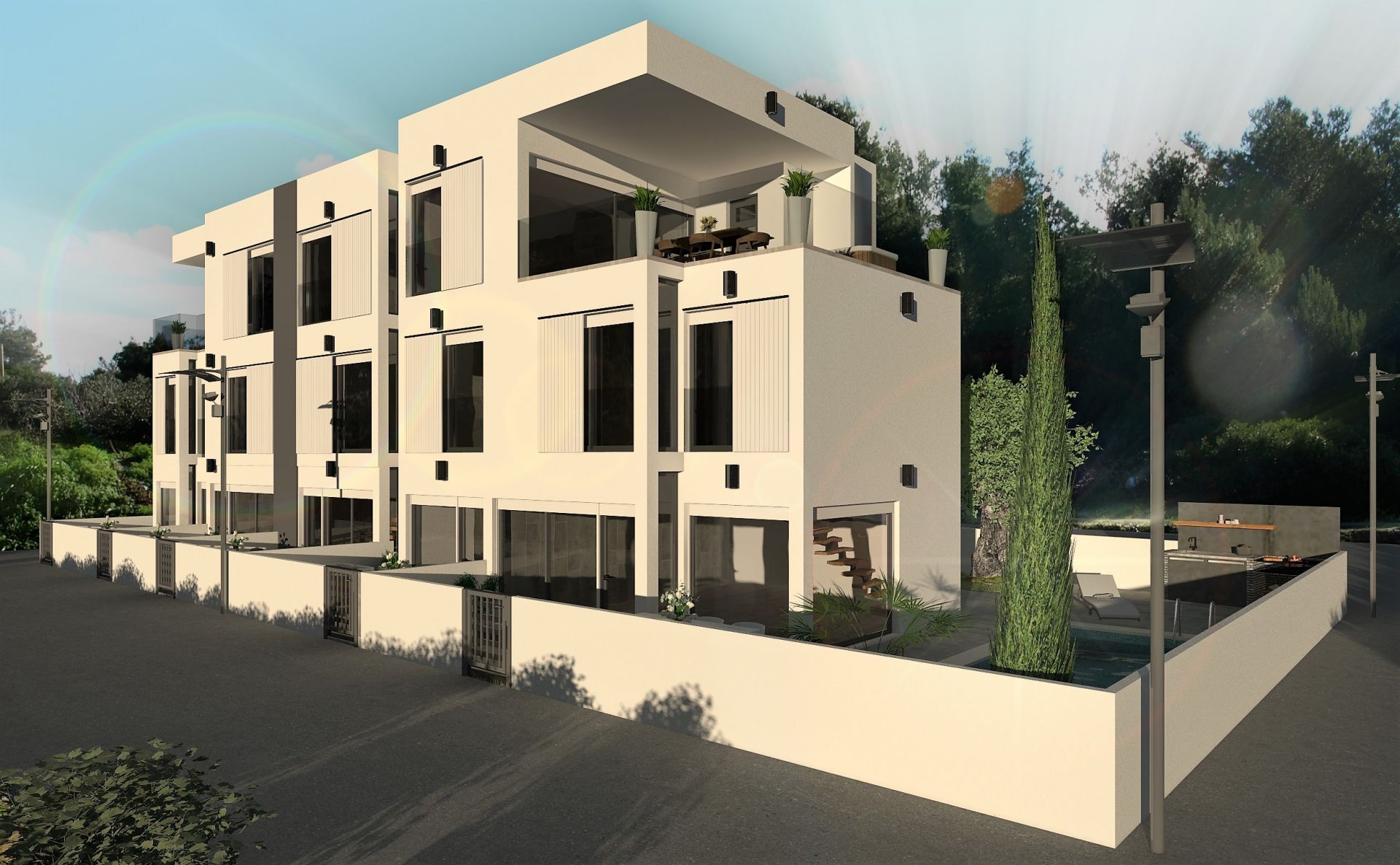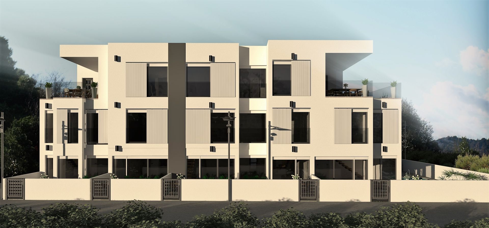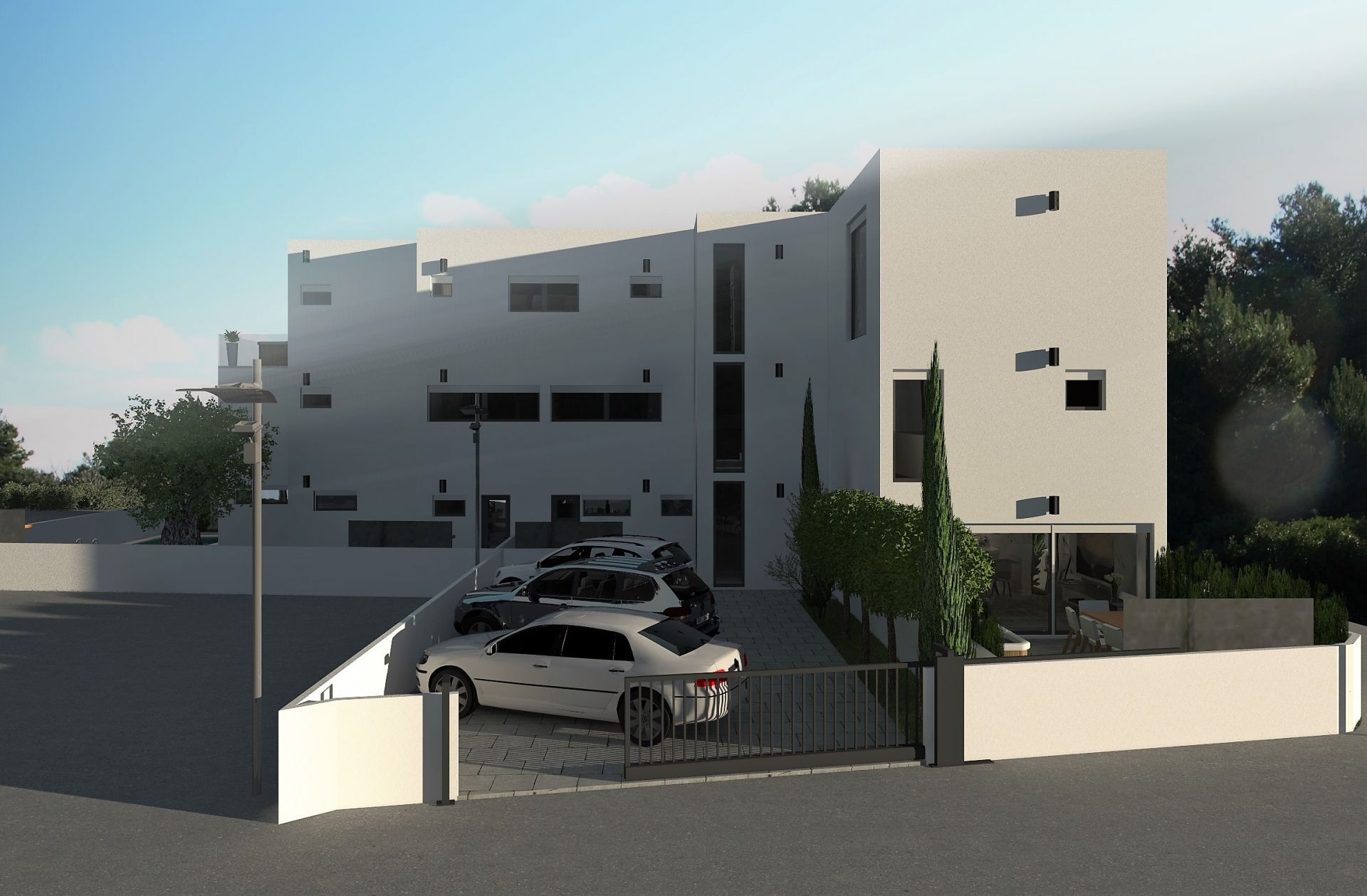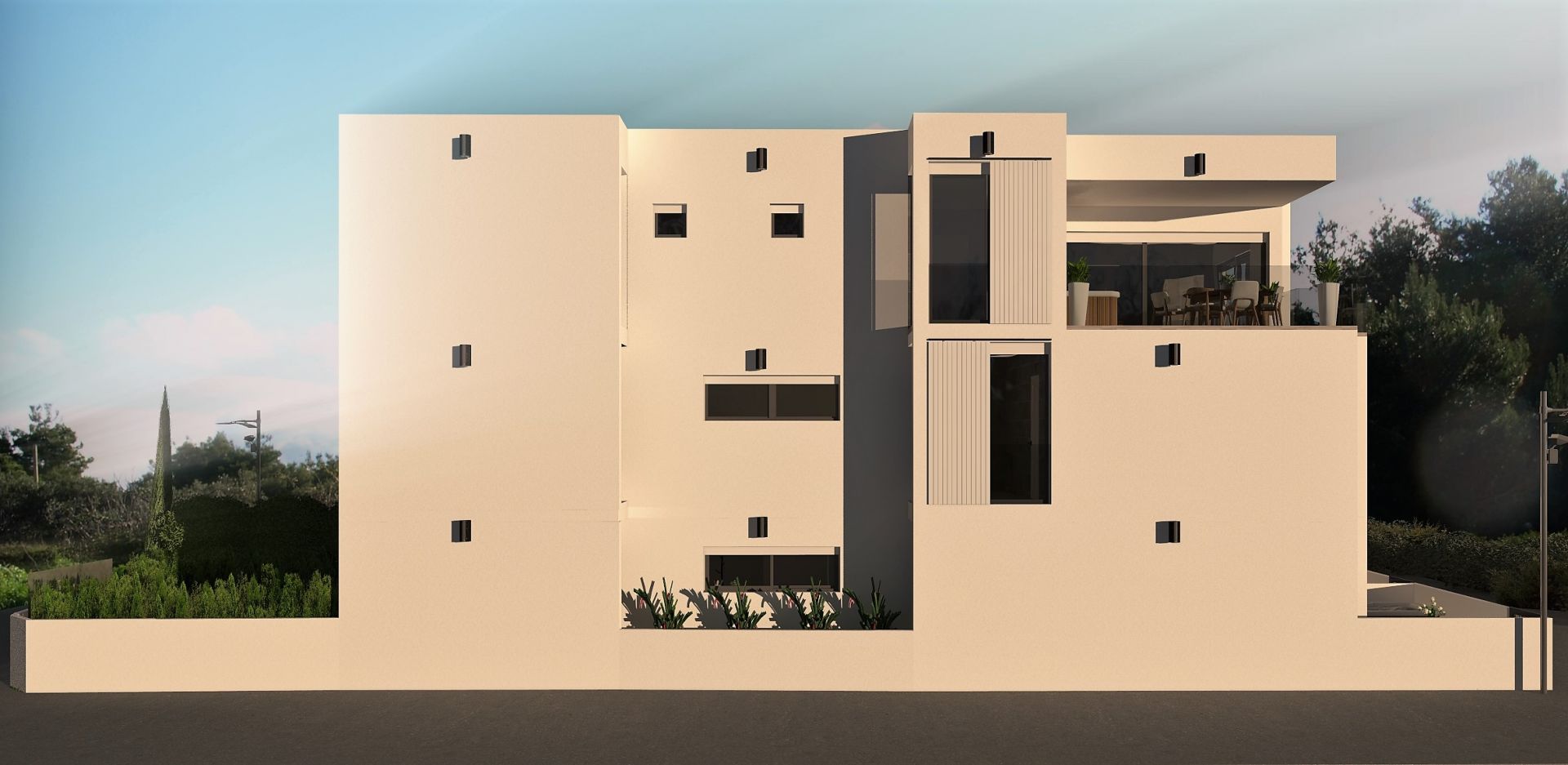 Apartment house will feature 6 duplex apartments with living area on ground floor and sleeping area on the first floor. Living area will consist of living room, kitchen, eating corner and day toilet. Communication with outdoor will be through floor to ceiling windows. Floating staircase will than lead you to upper floor where two bedrooms (except at one apartment which will offer one bedroom) and a bathroom will offer quiet place to relax and views to the sea. Several options of materials and colours will be available to choose from. All duplex apartments will have at least one generously sized terrace (some even two). One apartment will have the option of private swimming pool and others option of private SPA Hot tube.