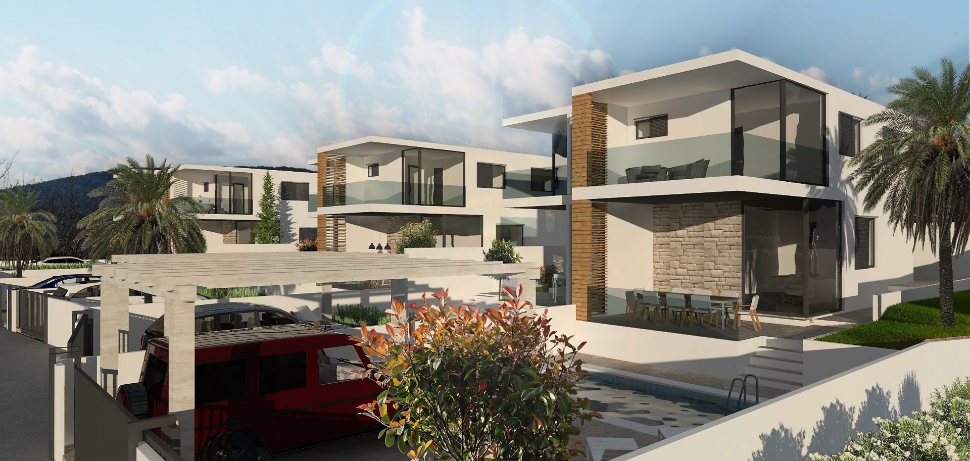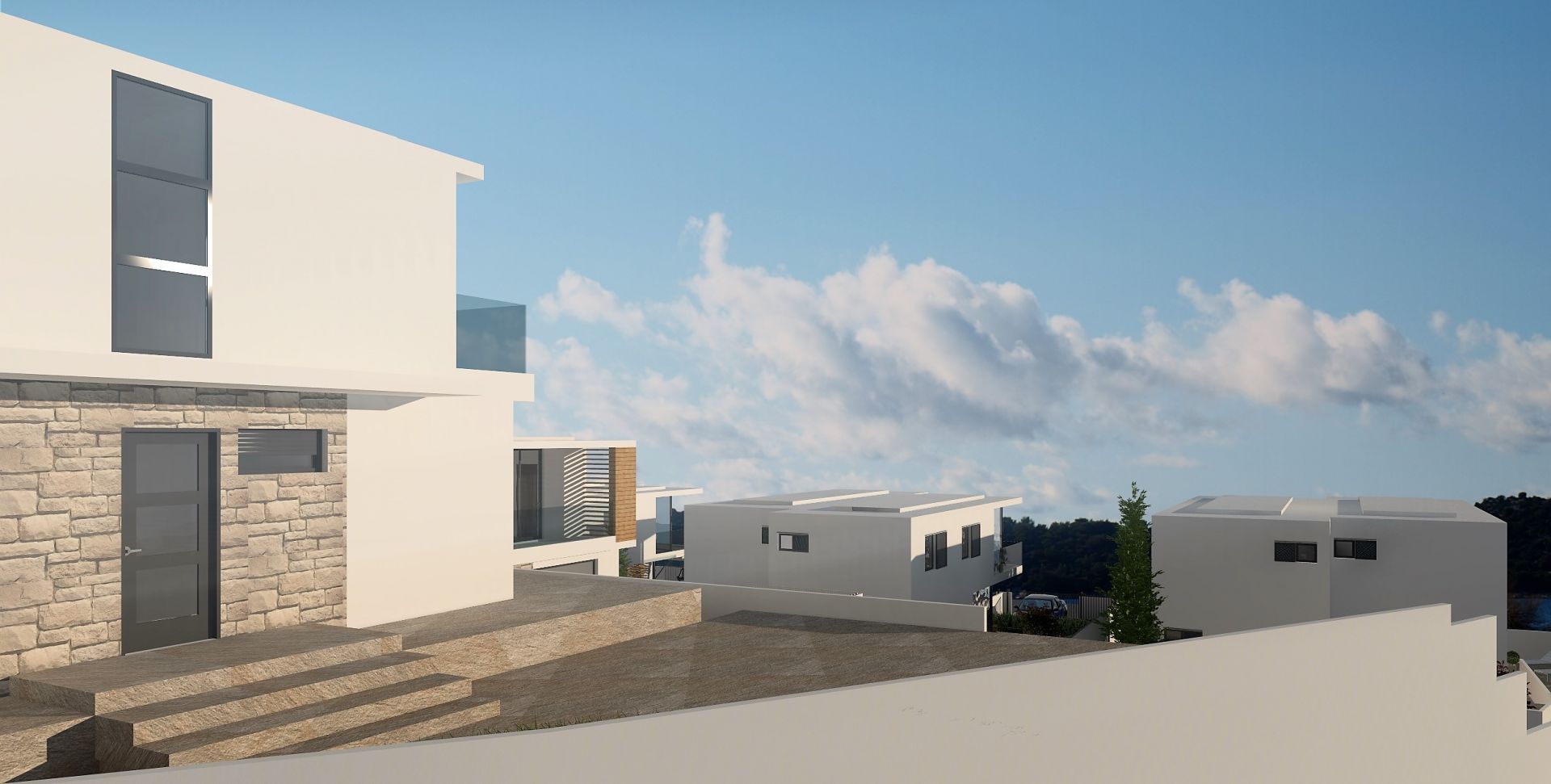 Project plan consist of 6 semi-detached houses and 2 individual houses. Houses will feature contemporary and elegant design with planed white or sandy exterior colour with anthracite floor to ceiling windows for calm and harmonious design.